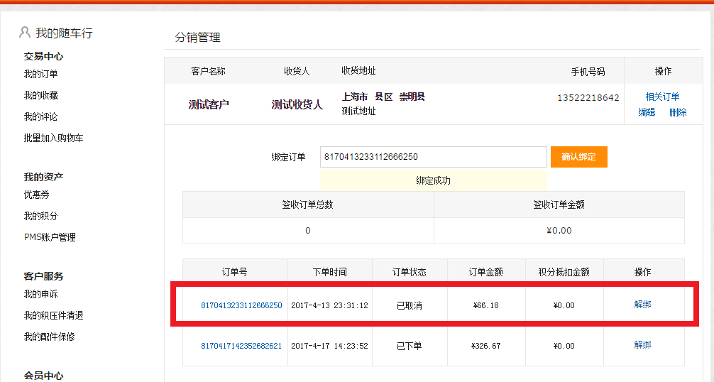 点击【相关订单】,填写订单号,点击【确认绑定】。